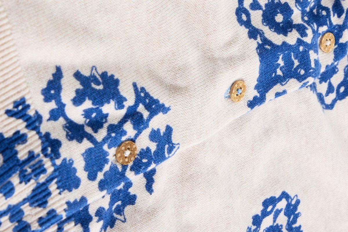 Il cardigan “Mykonos” è questo cardigan stampato in cotone biologico. Si abbina in modo versatile a jeans o a un vestito ed è quindi la tendenza moda perfetta per la primavera 2026.